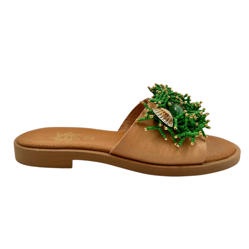 Γυναικεία χειροποίητα σανδάλια Ελληνικής κατασκευής σε χρώμα φυσικό. Διαθέτουν δερμάτινο άνω μέρος στολισμένο με χειροποίητα διακοσμητικά από πράσινα κοράλλια με πέτρες και κοχύλια κεντημένα στο χέρι, ντυμένο μαλακό πάτο κι αντιολισθητική σόλα. Φόρμα κανονική.