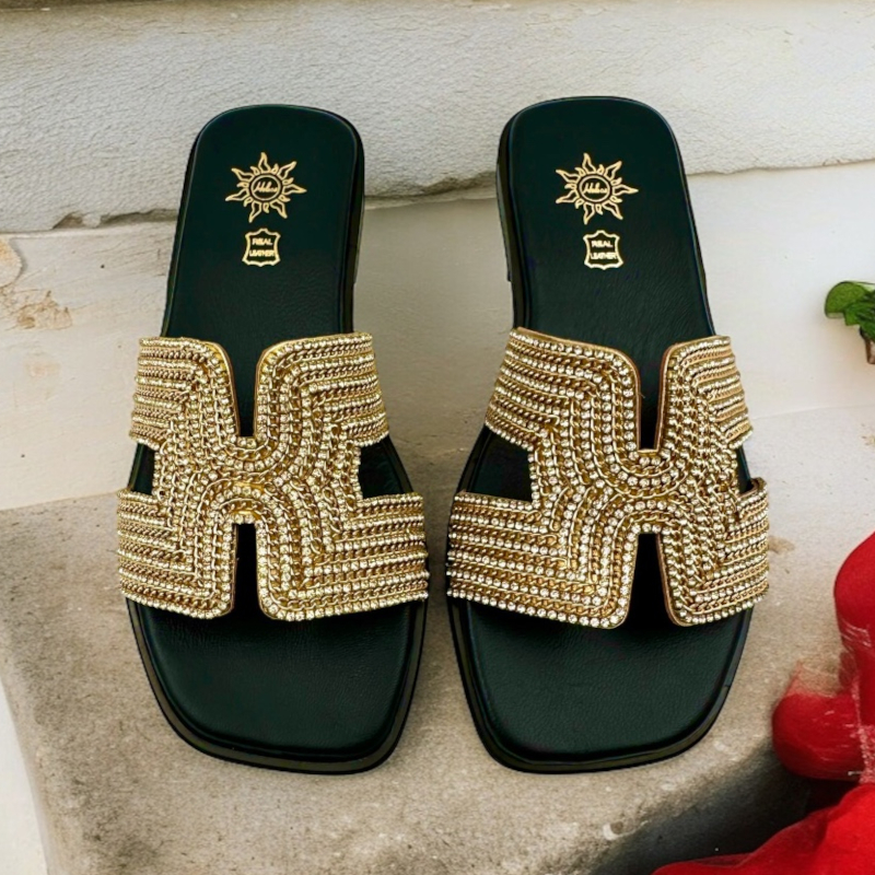Διαθέτουν οικολογικό δερμάτινο άνω μέρος σε χρώμα χρυσό με crystal στρας, ντυμένο μαλακό δερμάτινο πάτο σε χρώμα μαύρο κι αντιολισθητική κρουπόν σόλα.