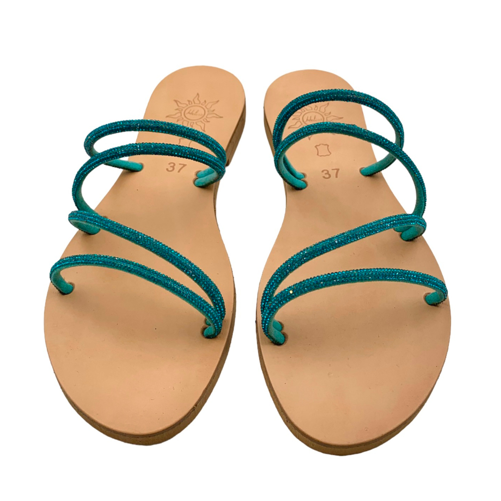 Γυναικεία χειροποίητα σανδάλια Ελληνικής κατασκευής σε χρώμα φυσικό. Διαθέτουν λουρί από στρας σε χρωμα blue zircon (τυρκουάζ) στο πάνω μέρος, οικολογικό πάτο κι ελαφριά cel σόλα. Φόρμα κανονική.
