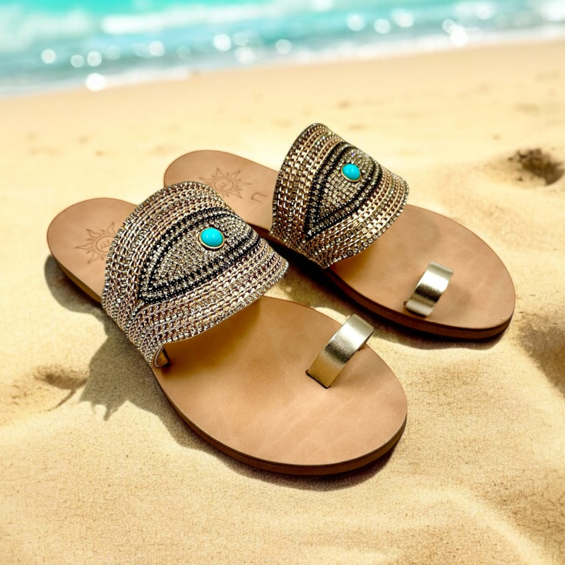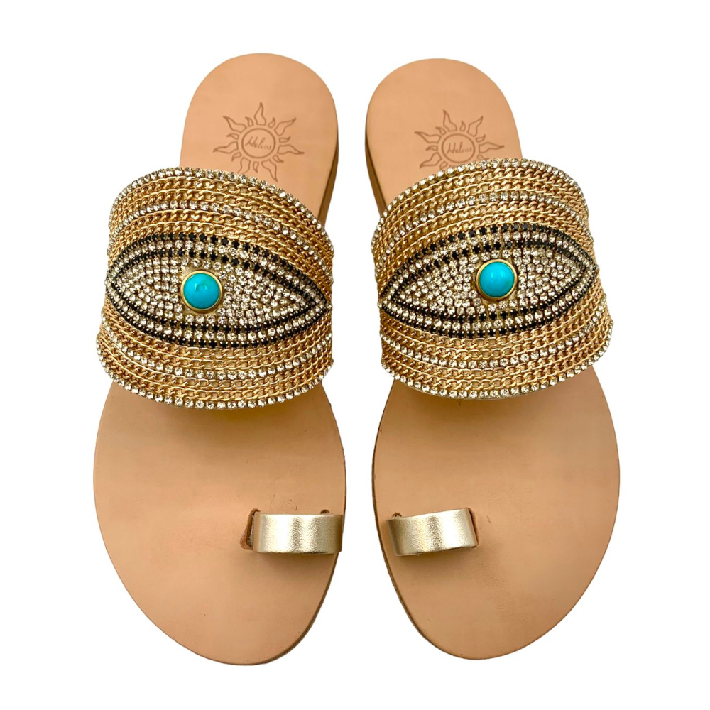 Γυναικεία χειροποίητα σανδάλια Ελληνικής κατασκευής σε χρώμα φυσικό, με διακοσμητικό μάτι από πέτρες και στρας σε χρυσό χρώμα στο πάνω μέρος. Διαθέτουν δερμάτινο άνω μέρος, οικολογικό πάτο κι ελαφριά cel σόλα. Φόρμα κανονική.