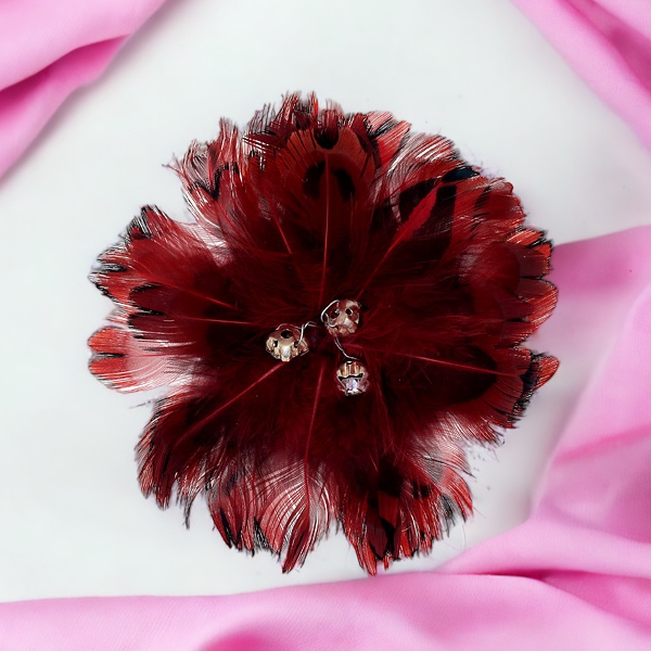 Διακοσμητικό λουλούδι από φτερά σε χρώμα μπορντώ, με στρας. Διάσταση βάσης 4 εκατοστά.
